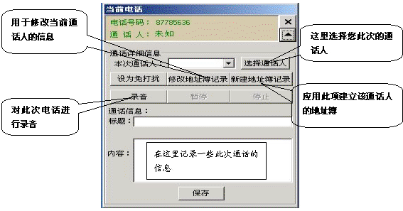如果有電話(huà)打入時(shí),在屏幕的右側(cè)會(huì)彈出一個(gè)對(duì)話(huà)框,它顯示了當(dāng)前來(lái)電的號(hào)碼和通話(huà)人(如果在地址簿中沒(méi)有記錄則顯示為未知),點(diǎn)擊彈出全部菜單功能,它相當(dāng)于一個(gè)功能強(qiáng)大的通話(huà)記事本,用它既可以邊接聽(tīng)電話(huà)邊整理相關(guān)通話(huà)的文字記錄,又可以錄下通話(huà)的全部?jī)?nèi)容。如果這個(gè)電話(huà)是您不愿接聽(tīng)的,也可以將它設(shè)置為“免打擾”,這樣,這個(gè)號(hào)碼以后將存入免打擾名單中,若此號(hào)碼再呼入,系統(tǒng)將自動(dòng)掛斷此呼叫。如果這個(gè)電話(huà)是您認(rèn)為的重要客戶(hù)打過(guò)來(lái)的,您也可以將此號(hào)碼添加到重要客戶(hù)組中,以便您今后接聽(tīng)或設(shè)置電話(huà)轉(zhuǎn)移時(shí)能與其它呼入電話(huà)相區(qū)分。