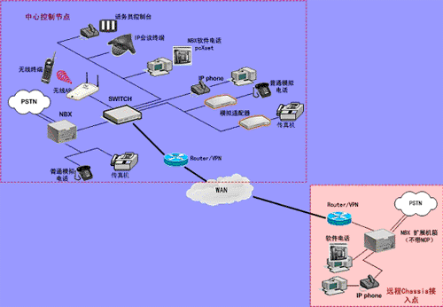遠(yuǎn)端也可以有單獨(dú)的 IP 話(huà)機(jī)(不需要 NBX 呼叫處理器)接入系統(tǒng)。