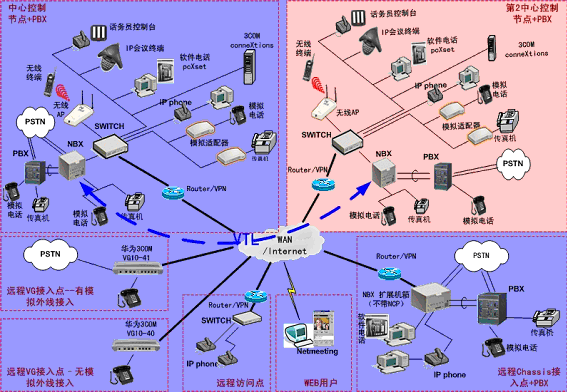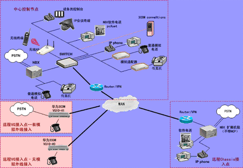 ③.遠(yuǎn)程接入的辦公室不再需要專(zhuān)用的 PBX, 只需要將3Com NBX電話(huà)終端接入到WAN網(wǎng)中,就能地實(shí)現(xiàn)在WAN或Internet上與3Com
