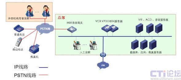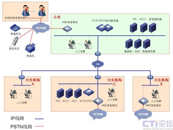 分支機(jī)構(gòu)B:網(wǎng)絡(luò)通過VPN技術(shù)與總部實(shí)現(xiàn)數(shù)據(jù)語音傳輸,部署MSR語音網(wǎng)關(guān)與當(dāng)?shù)豍STN網(wǎng)連接,IP坐席。兩地申請相同的客服號碼,兩地內(nèi)撥打客服號碼,客戶無長途話費(fèi)產(chǎn)生。適用與總部與分支處在不同省市。