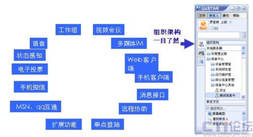 UcSTAR :Unified Communication Star,是深圳市擎旗信息技術(shù)有限公司推出的企業(yè)級融合通信平臺。是融合多種通訊手段(IM、文件、視頻、語音、EMAIL、SMS、電話、VOIP、MSN/QQ互通),融合企業(yè)的多種應用系統(tǒng)緊密集成(OA、CMS、ERP、EIP、Portal、網(wǎng)站、應用軟件),交流對象和交流內(nèi)容可管理,可控制,可擴展,輕松實現(xiàn)部署企業(yè)的統(tǒng)一工作平臺。 UcSTAR能統(tǒng)一消息、統(tǒng)一溝通、統(tǒng)一管理、隨意選擇多種溝通手段,深航一直在找這樣的一種產(chǎn)品,公司信息部門從上到下給予極高的重視,商務(wù)的過程也都開了綠燈,一路順暢。