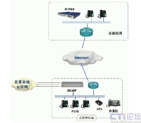 如上圖所示,通過(guò)SE30P的內(nèi)置FXO接口,可以實(shí)現(xiàn)與北京PSTN網(wǎng)絡(luò)的互聯(lián),解決北京分公司與中國(guó)用戶的通信;通過(guò)SE30P的IP中繼方式,實(shí)現(xiàn)與總部的IP PBX互聯(lián),變國(guó)際長(zhǎng)途為內(nèi)部通話,為公司節(jié)省了大量辦公費(fèi)用;公司內(nèi)部使用IP話機(jī)作為人工總機(jī)和分機(jī),并通過(guò)ATA實(shí)現(xiàn)傳真接入。