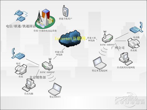 BiPAC 6404VGP其實就是一個VoIP語音網(wǎng)關(guān),VoIP就是一種把語音信號轉(zhuǎn)換成在網(wǎng)絡(luò)上傳輸?shù)臄?shù)字信號的技術(shù),它的應(yīng)用已經(jīng)非常成熟,我們經(jīng)常使用的QQ語音聊天功能也就是VoIP的一種表現(xiàn)形式。在所有大型跨國企業(yè)里我們幾乎都能看到VoIP技術(shù)的身影,這是因為電信運(yùn)營商的長途電話費一般都不便宜,而我們企業(yè)的網(wǎng)絡(luò)使用費一般又是包月的,通過無限包月的網(wǎng)絡(luò)打免費的國際國內(nèi)長途電話不就是占電信的便宜嘛?