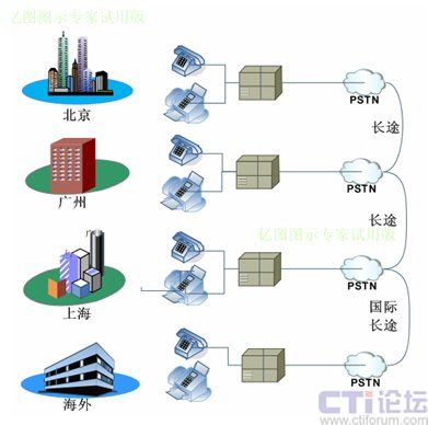 各分支機(jī)構(gòu)租用獨(dú)立的電話號(hào)碼并接入當(dāng)?shù)豍STN,在這種架構(gòu)下,各地之間通話就會(huì)產(chǎn)生長途費(fèi)用,并占用電話線路,但如果使用IP