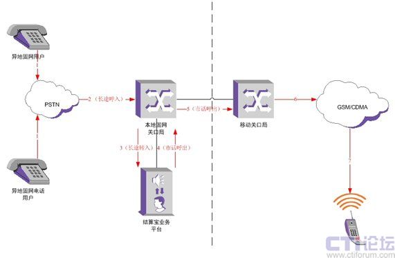 異地本網(wǎng)(例如太原鐵通)用戶呼叫本地移動(dòng)(例如杭州移動(dòng))用戶,系統(tǒng)會(huì)經(jīng)過杭州的關(guān)口局將該呼叫送至移動(dòng)的關(guān)口局。結(jié)算寶業(yè)務(wù)平臺(tái)掛接在本地關(guān)口局上,攔截這類呼叫,并將長(zhǎng)途號(hào)碼替換為本地號(hào)碼,然后通過本地關(guān)口局轉(zhuǎn)呼出去。