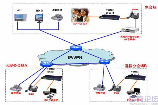 當(dāng)視頻會(huì)議召開(kāi)時(shí),主會(huì)場(chǎng)的翻譯既通過(guò)同聲傳譯系統(tǒng)把翻譯好的內(nèi)容傳輸?shù)奖镜氐呐c會(huì)者,也通過(guò)IP音頻會(huì)議系統(tǒng)把翻譯好的內(nèi)容傳輸?shù)竭h(yuǎn)端的會(huì)場(chǎng),遠(yuǎn)端會(huì)場(chǎng)把音頻系統(tǒng)傳輸過(guò)來(lái)的聲音經(jīng)過(guò)EF2211聲音處理系統(tǒng)處理后傳輸?shù)酵晜髯g系統(tǒng),同聲傳譯系統(tǒng)把聲音經(jīng)無(wú)線耳機(jī)傳送給需要的與會(huì)者。這樣遠(yuǎn)端會(huì)場(chǎng)的與會(huì)者既可以聽(tīng)到主會(huì)場(chǎng)的原聲,也可以聽(tīng)到翻譯好的內(nèi)容。相反,當(dāng)分會(huì)場(chǎng)發(fā)言時(shí)分會(huì)場(chǎng)也可以把本會(huì)場(chǎng)的原聲和翻譯好的內(nèi)容傳輸?shù)街鲿?huì)場(chǎng)。這樣就可以實(shí)現(xiàn)遠(yuǎn)程同聲傳譯。能同時(shí)滿足與會(huì)的所有人員的翻譯需求,既做到翻譯內(nèi)容的統(tǒng)一,又節(jié)省了翻譯人員的人力成本。