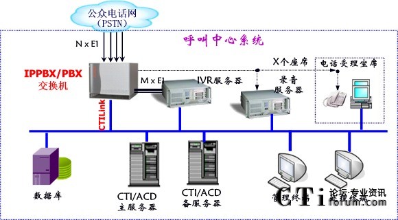 交換機方案主要由PBX/IPPBX交換機提供前段接入交換設(shè)備,后端計算機應(yīng)用系統(tǒng)通過CTI Link與交換機交互和通信,并實現(xiàn)CTI控制;