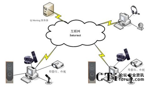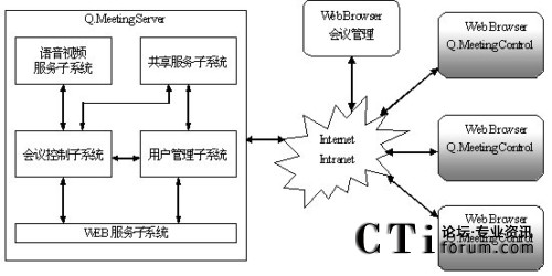 系統(tǒng)選用北京億方連線通訊技術(shù)有限公司具有國(guó)際先進(jìn)水平的全新第四代網(wǎng)絡(luò)視頻協(xié)作會(huì)議中心Q.Meeting為核心進(jìn)行構(gòu)建,該系統(tǒng)由會(huì)議服務(wù)器Q.Meeting Server和基于IE 瀏覽器的客戶端組成。Q.Meeting Server運(yùn)行于一臺(tái)服務(wù)器上,構(gòu)成網(wǎng)絡(luò)會(huì)議中心,提供會(huì)議控制、視頻服務(wù)、語(yǔ)音服務(wù)、共享服務(wù)、WEB服務(wù)和會(huì)議用戶管理等功能。所有參加會(huì)議的人員只需通過(guò)IE瀏覽器訪問(wèn)會(huì)議中心網(wǎng)站就可以參加會(huì)議,通過(guò)訪問(wèn)會(huì)議頁(yè)面和嵌于其中的客戶端插件Q.Meeting Control實(shí)現(xiàn)音頻和數(shù)據(jù)共享等交流。