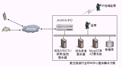 本方案采用Avaya IP office系列交換機,通過訊鳥中間件控制整個呼叫中心的電話呼入、呼出。它支持多種聯(lián)絡渠道,包括語音、交互式自動語音應答(IVR)、傳真、電子郵件、web、短消息等,同時利用Myair航空管理系統(tǒng)來完成整個業(yè)務流程,廣泛適用于航空旅游服務公司訂房、訂票呼叫中心的業(yè)務需求。