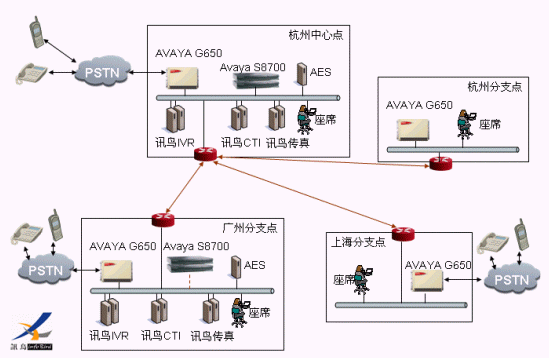 整個呼叫中心包括一個中心點杭州創(chuàng)業(yè)大廈,3個分支點分別在杭州華星大廈、上海與廣州。實現(xiàn)中繼分散接入,座席分散與集中相結合,整個呼叫中心集中控制的方式。杭州中心點采用一套AVAYA S8710、一套訊鳥CTI/IVR/傳真集中控制,其他各點通過G650接入。其中廣州分支點由于座席數(shù)較多,單獨部署一臺AES服務器、一套訊鳥CTI/IVR/傳真服務器。廣州點的一套AVAYA S8700作為本地再生服務,一旦廣域網(wǎng)電路中斷,立即接管承擔一個獨立的呼叫中心,AES服務器、訊鳥CTI、IVR服務器隨之與新的AVAYA S8700交換機聯(lián)接,保證24小時不間斷運行的要求。