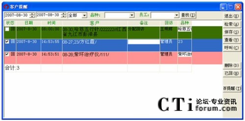 對于已經(jīng)回訪過的提醒,選定它并單擊已回,這樣它的狀態(tài)就會標(biāo)記為已回,再單擊一下查找,則剛才設(shè)定為已回的提醒,記錄的顏色變?yōu)榉奂t。