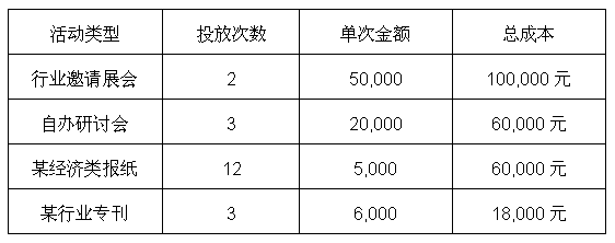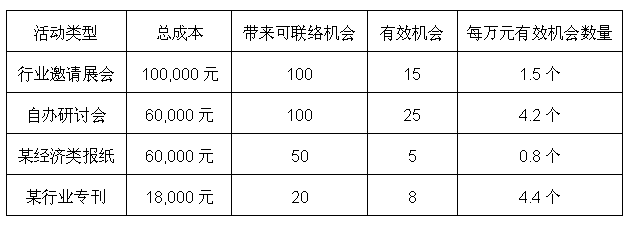 從前面的分析中,我們曾經(jīng)談到過:市場的核心是用最低的成本,幫助企業(yè)把目標(biāo)客戶推動成為機(jī)會客戶。那么,同樣成本推動為有效機(jī)會客戶數(shù)量的多少,則是評價市場方案的有效模型。當(dāng)然,針對個人消費市場,似乎可以用更加簡單的投入產(chǎn)出比進(jìn)行分析,一種類型的市場投放運作,在一定時間內(nèi)帶來的業(yè)績收益與成本的比較,可以方便地了解到不同類型市場投放的效益對比;而對于大部分需要有銷售過程的機(jī)構(gòu)消費客戶,我們可以參考以下我們對劉總公司拿出的模型示例: