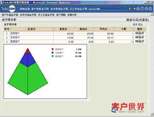 根據(jù)預(yù)先設(shè)定的客戶價值評估模型,CRM會自動計算出每個客戶的價值得分以及對應(yīng)到不同等級的客戶價值,并會記錄到客戶項下,便于業(yè)務(wù)人員在與客戶接觸時,直觀了解客戶價值情況。客戶價值金字塔分析(如圖),可以動態(tài)的了解各類客戶的價值分布。