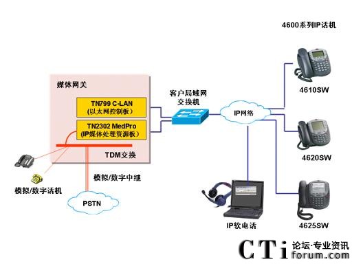 IP終端通過(guò)企業(yè)的數(shù)據(jù)網(wǎng)絡(luò)平臺(tái)進(jìn)行部署,媒體網(wǎng)關(guān)上配置相應(yīng)的IP板卡為IP電話終端提供登錄、注冊(cè)和語(yǔ)音處理,如下圖所示: