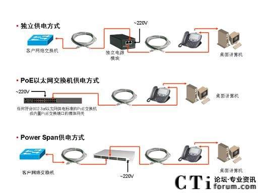 IP電話相對(duì)于原有模擬分機(jī)或數(shù)字分機(jī)采用以太網(wǎng)端口連接,其供電方式也相應(yīng)隨之改變,46xx系列IP硬件話機(jī)支持以下3種供電方式: