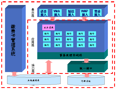 繳費卡系統(tǒng)采用客戶層+服務層+數(shù)據(jù)庫的三層體系結(jié)構(gòu)。出于性能上的考慮,將繳費卡管理系統(tǒng)設計成C/S結(jié)構(gòu)。繳費卡銷售系統(tǒng)用三層結(jié)構(gòu)實現(xiàn),客戶端表示層提供給用戶銷售、查詢、充值界面;在應用層,繳費卡接口不僅為銷售系統(tǒng)服務,還對外提供服務的統(tǒng)一接口;外部系統(tǒng)接入統(tǒng)一由繳費卡接口層支持。