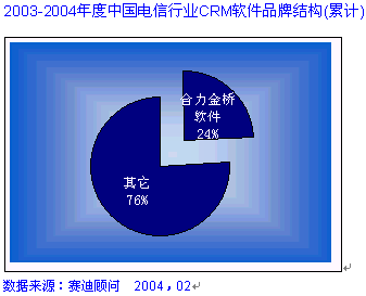 2004年2月10日,北京。賽迪顧問(CCID Consulting )在中國大飯店隆重舉辦了"2004IT市場年會", 會上發(fā)布了《2003-2004年中國管理軟件產(chǎn)業(yè)投資機會研究年度報告》。HOLLYCRM(合力金橋軟件)公司在強手如林的評選中憑借其強勁的市場占有份額、深厚的品牌實力及出眾的用戶美譽度無可爭議地穩(wěn)居2003年度中國CRM軟件整體市場份額前三甲, 同時更奪得了2003年度中國電信行業(yè)CRM市場份額龍頭位置。