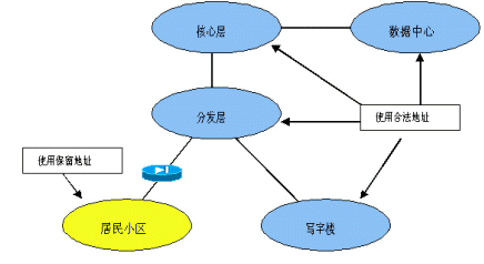 考慮IP地址資源有限,因此,居民小區(qū)接入用戶量大,地址使用效率低,因此在居民小區(qū)部分采用RFC 1519規(guī)定的保留地址,建議采用10.0.0.0。在每個小區(qū)的出口處配備地址轉(zhuǎn)換設備,實現(xiàn)保留地址和合法地址之間的轉(zhuǎn)換。