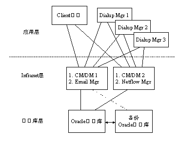 硬件平臺呈3層結(jié)構(gòu),分別為應用層、Infranet計費和用戶管理層以及數(shù)據(jù)庫層。
