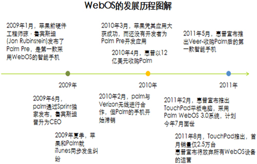 從WebOS的發(fā)展歷程看,惠普收購Palm后,1年之后才推出一款新的智能手機,今年8月才推出了首款平板電腦TouchPad.而TouchPad的月銷量不佳成為導(dǎo)火索,惠普最終決定放棄所有WebOS設(shè)備的運營。