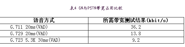 為進(jìn)一步節(jié)省帶寬,又采用語(yǔ)音激活檢測(cè)技術(shù)(VAD)及舒適噪音生成(CNG)技術(shù),VAD技術(shù)只有當(dāng)檢測(cè)到語(yǔ)音處于活動(dòng)狀態(tài)時(shí),編碼器的輸出信號(hào)才被送到網(wǎng)絡(luò)上,因此節(jié)省了帶寬。而在靜音時(shí)段采用CNG技術(shù),生成與背景噪聲相匹配的較舒適的靜音,避免了用戶有不自然的交談感覺(jué),保證通話質(zhì)量。實(shí)際測(cè)試結(jié)果如表4,采用G.72920ms打包+VAD技術(shù)節(jié)省了近75%的帶寬。