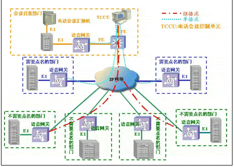 采用原有的會議電話架構(gòu),只是話音的長途連接由模擬專線等改為IP傳輸。方案由于采用原有電話會議匯接機,保護了用戶的原有投資。缺點是在召開多級會議電話時,由于語音信號首先在召集單位語音網(wǎng)關(guān)進行壓縮,經(jīng)IP傳輸后,在二級單位語音網(wǎng)關(guān)解壓縮還原為模擬話音,再經(jīng)二級單位的語音網(wǎng)關(guān)二次壓縮,經(jīng)IP網(wǎng)傳輸后,在三級單位的語音網(wǎng)關(guān)上二次解壓縮,導致語音信號多次壓縮/還原,對語音質(zhì)量損傷較大。