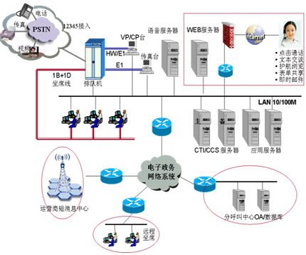 華為12345政府熱線系統(tǒng)解決方案,是一個(gè)集語音技術(shù)、通信技術(shù)、計(jì)算機(jī)網(wǎng)絡(luò)、數(shù)據(jù)庫技術(shù)于一體,支持電話、傳真、電子郵件、Web等多種媒體接入方式的呼叫中心解決方案。該系統(tǒng)充分考慮了政府服務(wù)熱線的現(xiàn)狀及存在的問題,并結(jié)合了政府特點(diǎn)的運(yùn)作模式,是華為公司在多年呼叫中心開發(fā)合作工作經(jīng)驗(yàn)積累基礎(chǔ)上推出的解決方案。整個(gè)系統(tǒng)整體結(jié)構(gòu)如下: