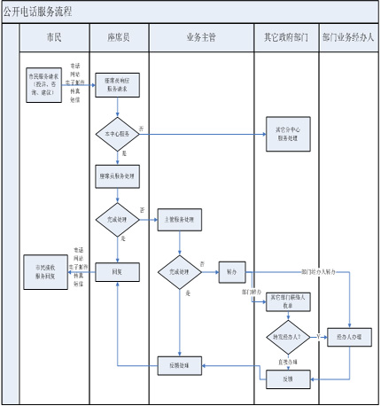后臺處理座席員根據(jù)業(yè)務(wù)知識、資料庫和管理職責(zé)為市民服務(wù),如果不能處理,將請求提交相關(guān)政府部門并限時(shí)處理;