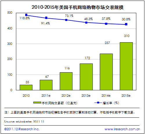 iResearch艾瑞咨詢整理eMarketer的最新數據研究發(fā)現,2011年美國手機網絡購物市場交易規(guī)模相比2010年增長91.4%,將達到67億美元。未來幾年,美國手機網購交易規(guī)模將繼續(xù)較快增長,預計2015年美國的手機網購交易規(guī)模將達到310億美元。