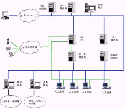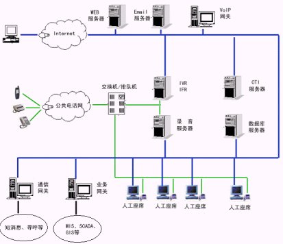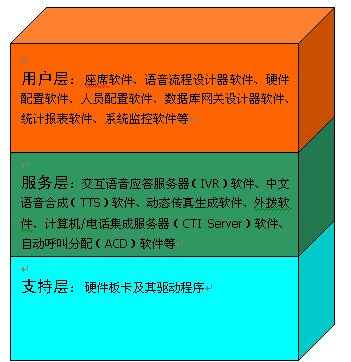 2、服務層:交互語音應答服務器(IVR)軟件、中文語音合成(TTS)軟件、動態(tài)傳真生成軟件、外撥軟件、計算機/電話集成服務器(CTI Server)軟件、自動呼叫分配(ACD)軟件等等。