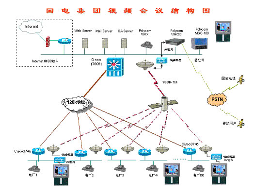 128,集團(tuán)下屬60個(gè)電廠均采用視頻終端ViewStation 128。整個(gè)網(wǎng)絡(luò)采用Polycom MCU的混速功能,在本部中心采用768Kbps進(jìn)行視頻傳輸,和下屬60個(gè)電廠及分公司采用128Kbps進(jìn)行傳輸。由于網(wǎng)絡(luò)傳輸線路分為衛(wèi)星線路和地面有線網(wǎng)絡(luò),衛(wèi)星線路帶寬為768Kbps-1Mbps,用于業(yè)務(wù)下行線路,地面有線網(wǎng)絡(luò)128Kbps用于視頻回傳。根據(jù)網(wǎng)絡(luò)傳輸線路的實(shí)際情況,在本部中心利用1臺(tái)視頻終端將其模擬信號(AV信號)送到衛(wèi)星端接設(shè)備(包含MODEM,編解碼器等),將模擬信號轉(zhuǎn)換成數(shù)字信號(MPEG4),利用768K-1Mbps衛(wèi)星線路廣播到每個(gè)接收點(diǎn),通過每個(gè)接收點(diǎn)的編解碼器將數(shù)字信號轉(zhuǎn)換成模擬信號連接到顯示終端(如TV、顯示器)上進(jìn)行收看,通過這種方式可以實(shí)現(xiàn)利用衛(wèi)星線路的高帶寬,并利用其廣播特性,節(jié)省投資。