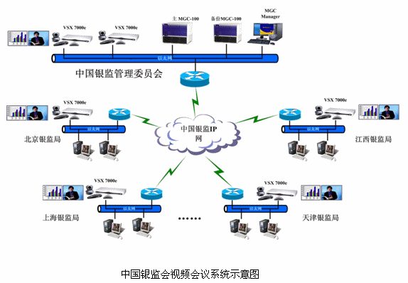 中國銀監(jiān)會目前已經(jīng)擁有一個高速、高可靠性的ATM骨干傳輸網(wǎng)絡(luò),網(wǎng)絡(luò)采用星形結(jié)構(gòu),各分支機構(gòu)到北京總部的線路均為2條15M ATM線路,這種優(yōu)良的網(wǎng)絡(luò)非常適合視頻會議業(yè)務(wù)的運營。視頻會議網(wǎng)建立完成后可以實現(xiàn)通過遠(yuǎn)程視頻會議,遠(yuǎn)程處理重點銀行業(yè)金融機構(gòu)監(jiān)事會的日常管理工作;遠(yuǎn)程審查銀行業(yè)金融機構(gòu)高級管理人員任職資格;遠(yuǎn)程討論協(xié)商制定有關(guān)銀行業(yè)金融機構(gòu)監(jiān)管的規(guī)章制度和辦法;遠(yuǎn)程對銀行業(yè)金融機構(gòu)實監(jiān)管,依法對違法違規(guī)行為進(jìn)行查處;更加可以通過遠(yuǎn)程雙流會議,按照國家有關(guān)規(guī)定,遠(yuǎn)程公布全國銀行數(shù)據(jù)、報表。