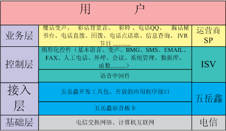 依靠五岳鑫公司強大的技術(shù)優(yōu)勢和對增值業(yè)務的深刻理解,以我公司自主研發(fā)的具有國際先進水平的語音板卡為基礎(chǔ),為廣大增值業(yè)務服務商提供的語音增值業(yè)務綜合平臺,將種類繁多的語音增值業(yè)務融合在一個系統(tǒng)平臺中。不僅支持行業(yè)內(nèi)大多數(shù)的語音增值業(yè)務,還能方便、快速地面向市場提供各種的語音增值業(yè)務。