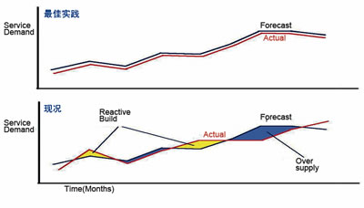 下一代網(wǎng)絡(luò)的IP化、智能化的趨勢(shì),使得服務(wù)路徑從靜態(tài)路由為主向動(dòng)態(tài)化、共享化轉(zhuǎn)變。這種轉(zhuǎn)變使得主動(dòng)的網(wǎng)絡(luò)容量規(guī)劃在下一代運(yùn)營(yíng)環(huán)境中具有更加重要的意義。準(zhǔn)確、真實(shí)、主動(dòng)的網(wǎng)絡(luò)容量計(jì)劃和趨勢(shì)分析能力將成為對(duì)OSS解決方案的關(guān)鍵需求。網(wǎng)絡(luò)規(guī)劃不僅可以幫助運(yùn)營(yíng)商準(zhǔn)確分配網(wǎng)絡(luò)容量,而且可以減少容量不足和失敗訂單,并可通過(guò)找出利用率不足的網(wǎng)絡(luò)資源來(lái)提高網(wǎng)絡(luò)運(yùn)行效率,如圖3所示。
