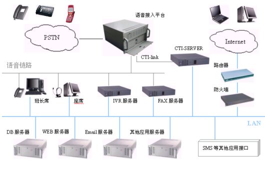 基本部分是呼叫中心的必要組成部分;静糠职ǎ褐悄芫W(wǎng)絡(luò)(IN)、自動(dòng)呼叫分配設(shè)備(ACD)、交互式語音應(yīng)答系統(tǒng)(IVR)、CTI服務(wù)器、人工座席、數(shù)據(jù)庫服務(wù)器、管理平臺(tái)等;擴(kuò)展部分是隨著呼叫中心技術(shù)的發(fā)展而逐漸豐富的,擴(kuò)展部分目前主要包括:Web服務(wù)器、Email服務(wù)器、傳真服務(wù)器、IP電話網(wǎng)關(guān)等。系統(tǒng)結(jié)構(gòu)如下圖所示: