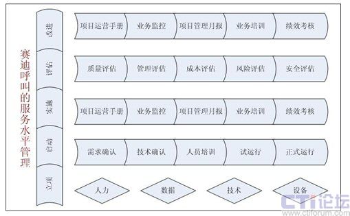 呼叫中心的服務(wù)水平管理通常包括以下一些內(nèi)容:    企業(yè)可根據(jù)自身特征、結(jié)合上述內(nèi)容,定義出符合自身呼叫中心屬性的服務(wù)水平管理內(nèi)容。以賽迪呼叫為例,作為一個(gè)外包型的呼叫中心,賽迪呼叫結(jié)合中國(guó)呼叫中心外包市場(chǎng)的特點(diǎn)及自身多年的行業(yè)經(jīng)驗(yàn),歸納出服務(wù)水平管理的五個(gè)步驟:立項(xiàng)、啟動(dòng)、實(shí)施、評(píng)估、改進(jìn),具體內(nèi)容如下: