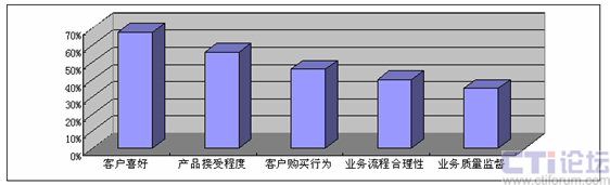 那么保險企業(yè)希望通過進(jìn)一步深入開展電話中心信息化工作得到哪些效用或者有價值的信息呢,我們認(rèn)為,電話中心為保險企業(yè)所提供的信息中最重要的依然是“客戶的聲音”,具體來說,包括客戶喜好和客戶購買行為等,其次便是業(yè)務(wù)流程信息。企業(yè)管理層對來自電話中心的不同信息的關(guān)注程度如下圖所示。