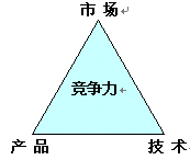 企業(yè)要發(fā)展, 關鍵于企業(yè)的核心競爭力, 企業(yè)如何具有核心競爭力, 特別是通信企業(yè), 我認為, 通信企業(yè)要具有核心競爭力, 決定于三個因素: 市場, 產(chǎn)品, 技術. 這三個因素構筑企業(yè)強大競爭力---競爭力三角型. 三角型的邊則是產(chǎn)品經(jīng)理的活動軌道. 圖1-1