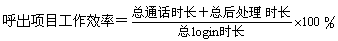 - 定義:呼出項(xiàng)目的工作效率是衡量呼出項(xiàng)目座席工作負(fù)荷率的主要KPI,一般指某段統(tǒng)計(jì)時(shí)間內(nèi),總處理時(shí)長與登錄系統(tǒng)時(shí)長的比率。對(duì)于沒有座席操作系統(tǒng)的呼叫中心可以將分母換成計(jì)劃工作時(shí)長。