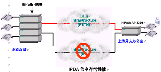 人們也許會(huì)問,IP語(yǔ)音(VoIP)是否足夠可靠?如果IP網(wǎng)絡(luò)上的信令通道出現(xiàn)故障,HiPath平臺(tái)仍將保證對(duì)各接入點(diǎn)的控制,從而提供了可靠的信令存活性能(Signaling Survivability)。在下面的圖例中,當(dāng)企業(yè)IP網(wǎng)絡(luò)出現(xiàn)某些問題后,信令通道轉(zhuǎn)移到了公共交換電話網(wǎng)絡(luò)(PSTN)之上。