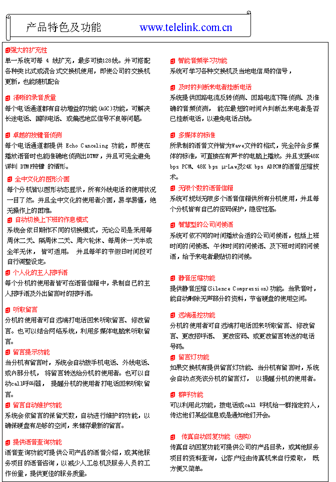 系統(tǒng)可提供直撥分機(jī),呼叫器,電話,移動(dòng)電話或點(diǎn)留言燈的方式通知分機(jī)主人有留言,聽(tīng)完留言即滅燈