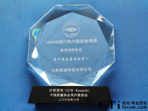 CTI論壇(ctiforum)09月03日消息: 在27日剛剛結(jié)束的“2009中國(guó)IT用戶(hù)滿(mǎn)意度年會(huì)”上,威速科技喜獲“2009軟件視頻會(huì)議IT用戶(hù)滿(mǎn)意度綜合第一”大獎(jiǎng)。憑借在產(chǎn)品與服務(wù)方面多年的優(yōu)異表現(xiàn),成立10周年的威速科技連續(xù)9年獲此殊榮,這也充分彰顯了威速科技已成為視頻會(huì)議軟件市場(chǎng)上公認(rèn)的滿(mǎn)意品牌。