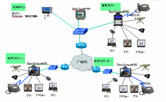 云南省中國銀行主會場放置1臺MGC-100 MCU和1臺視訊會議終端ViewStation4000,1套雙流模塊;其他16個地市各放置1臺視訊會議終端ViewStation4000,1套雙流模塊。MCU和視訊終端通過以太網(wǎng)交換機接入傳輸網(wǎng)絡(luò),根據(jù)各分地市網(wǎng)絡(luò)實際帶寬,視頻會議的帶寬定為2M。