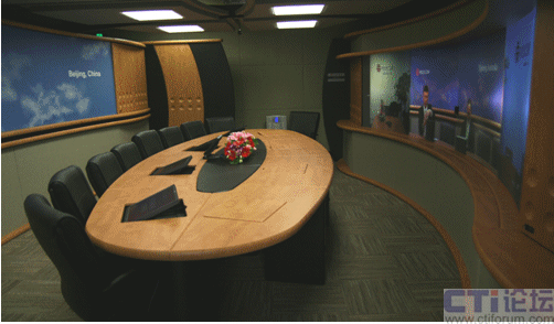 雖然對(duì)“極致遠(yuǎn)真”早有耳聞,但踏入體驗(yàn)室的那一刻,眼前的一切還是超出了我的想象:與眾不同的寬銀幕全景顯示屏呈現(xiàn)獨(dú)特的弧形設(shè)計(jì),感覺(jué)像是進(jìn)入了環(huán)形電影院,處于關(guān)閉狀態(tài)的大屏幕巧妙的鑲嵌在墻壁上,一張能容納16個(gè)人同時(shí)開會(huì)的大型會(huì)議桌占據(jù)了會(huì)議室的中心部位。此外,室內(nèi)的桌椅、墻壁、天花板等整套家具都是經(jīng)過(guò)精心裝飾的,這時(shí)的體驗(yàn)中心更像一間豪華的商務(wù)會(huì)議室。