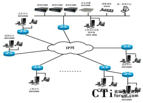 RMX1000作為多媒體多點(diǎn)處理單元,70臺HDX8006和HDX8002分布在全國各個分行作為視頻會議的接入,RSS2000服務(wù)器提供HD的會議錄制;65臺IP電話作為實(shí)時會議備份系統(tǒng);整個系統(tǒng)提供720P/60幀或1080P/30幀的會議畫面質(zhì)量,音頻達(dá)到22KHz寬帶音質(zhì),劇院級音質(zhì)享受,具備新一代高清雙流P