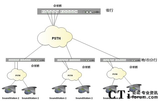 根據(jù)客戶需要在降低會(huì)議成本的前提下實(shí)現(xiàn)快速、便捷、實(shí)時(shí)的多點(diǎn)之間多人會(huì)議溝通的需求,我們制定了以下解決方案;系統(tǒng)利用傳統(tǒng)電話網(wǎng)絡(luò),是客戶擁有自己的會(huì)議管理系統(tǒng);省行方面使用Polycom SS2基本型商務(wù)會(huì)議電話或普通模擬電話;各個(gè)市/縣級(jí)分行,根據(jù)自己會(huì)場(chǎng)的情況自選設(shè)備;