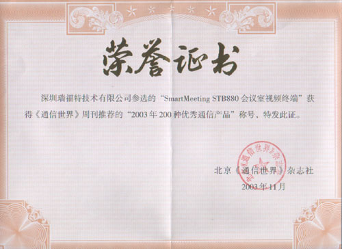 2003年是視頻會議突飛猛進的一年,今年11月由北京《通信世界》雜志社主辦的"2003年200種優(yōu)秀通信產(chǎn)品"評選活動已經(jīng)揭曉,深圳市瑞福特信息技術(shù)有限公司的SmartMeeting STB880會議室視頻終端獲得此榮譽稱號。