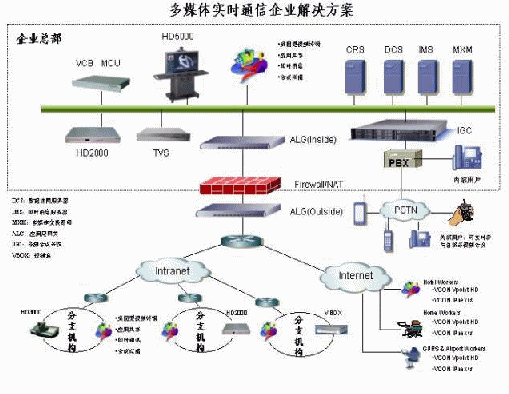 VCON提供了以HD系列的視頻終端產(chǎn)品和以VCB系列的多點控制單元(MCU)產(chǎn)品來構(gòu)建基于IP網(wǎng)絡(luò),采用H.323協(xié)議作為標(biāo)準(zhǔn)協(xié)議的視頻通信解決方案。通常主會場選擇會議室型終端HD5000,該終端在64Kbit/s下就可以實現(xiàn)畫面流暢的動態(tài)雙流;主會場也可以選擇機(jī)架式會議終端HD2000,這樣主會場可以選配正裝和吊裝攝像機(jī),拍攝會場不同角度的場景;多點控制單元(MCU)選擇VCB3000,同時可以為領(lǐng)導(dǎo)、個人桌面或者出差用戶單獨配置支持H.323標(biāo)準(zhǔn)的Vpoint HD軟終端,該終端是目前業(yè)界惟一支持H.264、雙流、組播接受以及遠(yuǎn)程控制的軟終端產(chǎn)品。