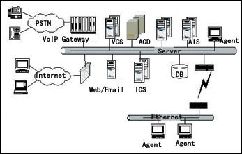 IP Contact Center主要由ACD Server、ICS Server、MCS Server、VCS Server以及AIS Server等構(gòu)成。各服務(wù)器均可采用服務(wù)器集群,進行線性疊加,以適應(yīng)系統(tǒng)線性擴容的需要。