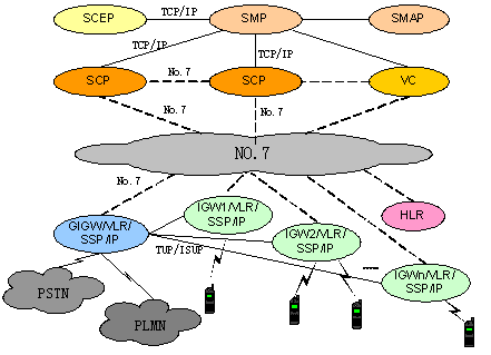 中興PCS智能網(wǎng)可根據(jù)用戶需要采用多種靈活的組網(wǎng)方案,既可全省或多地區(qū)集中建設(shè)一套平臺(tái),充分節(jié)約投資和快速進(jìn)行業(yè)務(wù)提供,又可按地市單獨(dú)建設(shè),充分保證業(yè)務(wù)的靈活性。系統(tǒng)支持與其他PCS網(wǎng)絡(luò)的良好互通,可同時(shí)為其它系統(tǒng)提供PCS智能業(yè)務(wù)。中興PCS智能網(wǎng)基于No.7信令與交換網(wǎng)絡(luò)連接,不占用話路資源,采用嵌入式組網(wǎng),智能業(yè)務(wù)采用簽約信息觸發(fā),SSP(Service Switch Point)和SCP(Service Control Point)之間采用No.7信令進(jìn)行通信,在這種組網(wǎng)方式下,不存在話路迂回,有效節(jié)約運(yùn)營(yíng)商寶貴的網(wǎng)絡(luò)資源,并可以根據(jù)簽約信息靈活開展多種智能業(yè)務(wù),智能網(wǎng)信令也能很好地支持用戶的移動(dòng)性,給用戶提供更靈活、方便和個(gè)性化的服務(wù)。